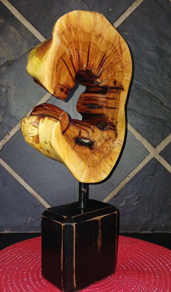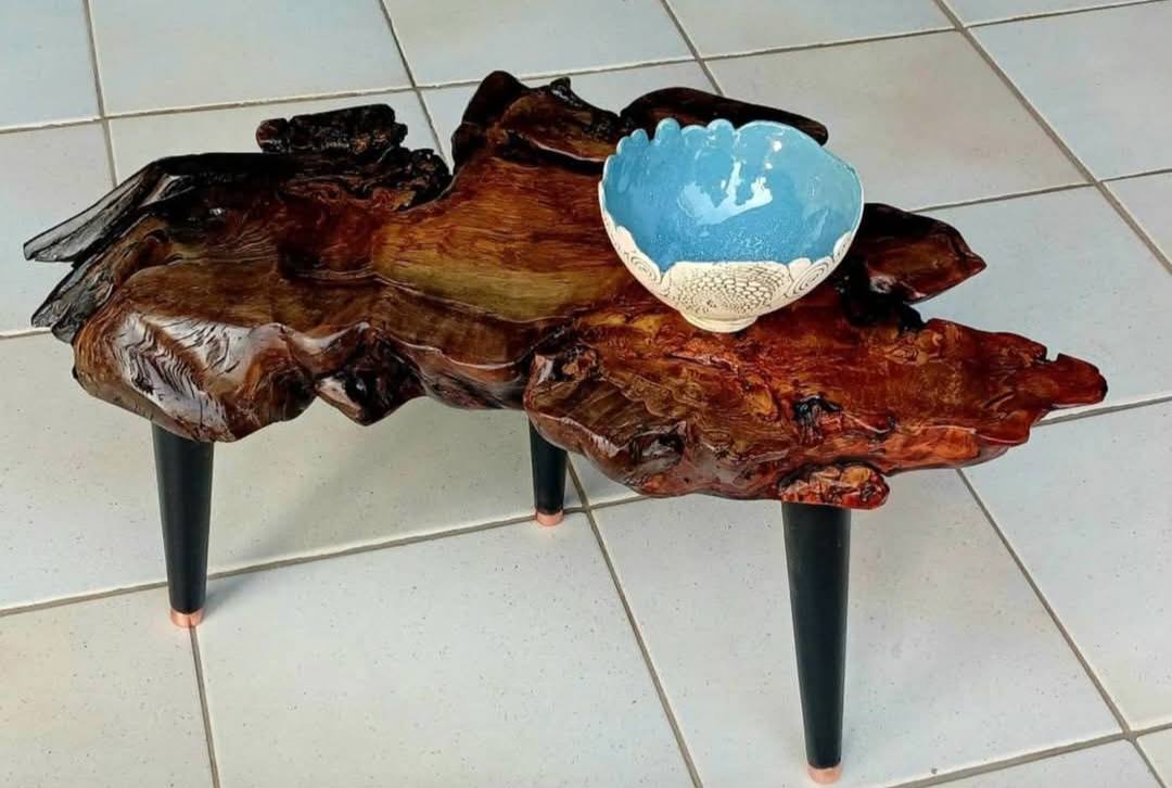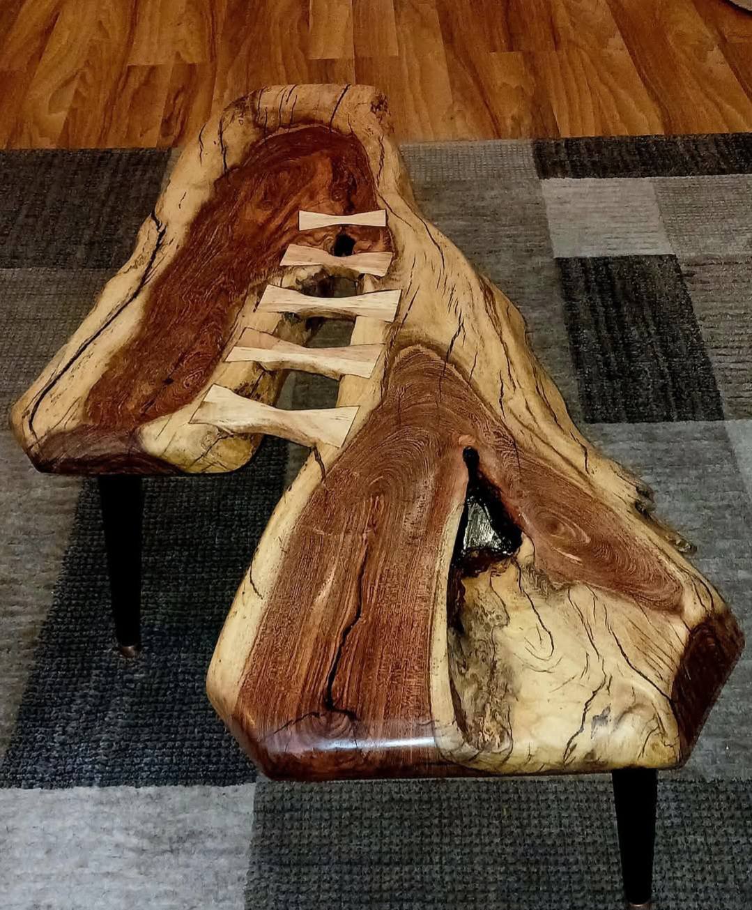 Handcrafted bedside table with beautiful wood grain, featuring a natural edge drawer front and steel hairpin legs.