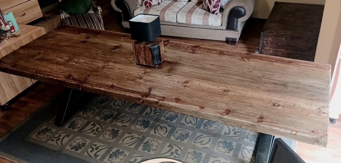 Largest table we've ever made. 3m x 1m. 7cm thick top is made from solid wood and has a beautiful textured finish. Custom steel legs complete this table perfectly.